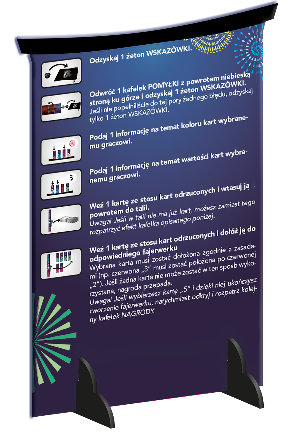 - Zagrać jedną ze swoich kart, czyli ujawnić ją, licząc, że będzie kontynuowała jeden z fajerwerków lub rozpocznie nowy.