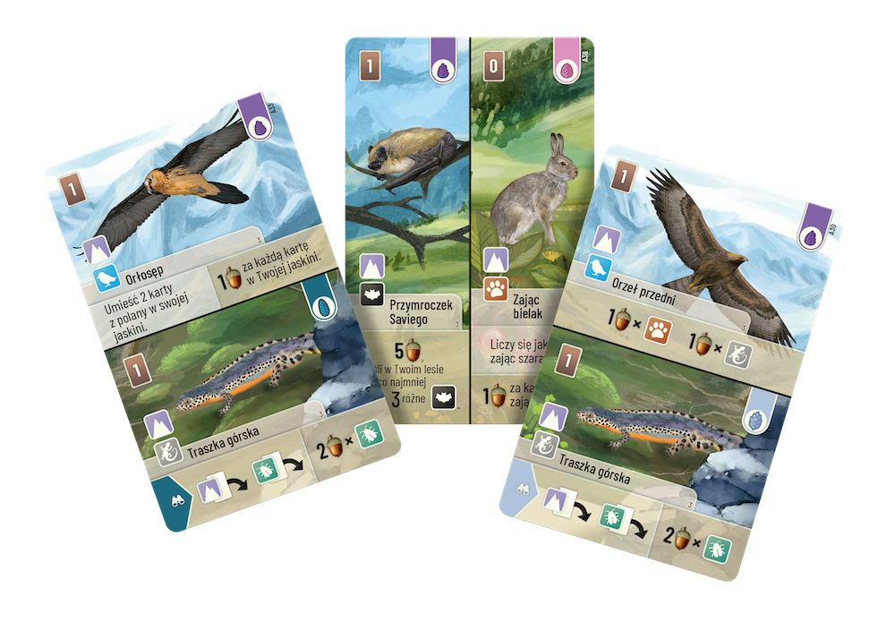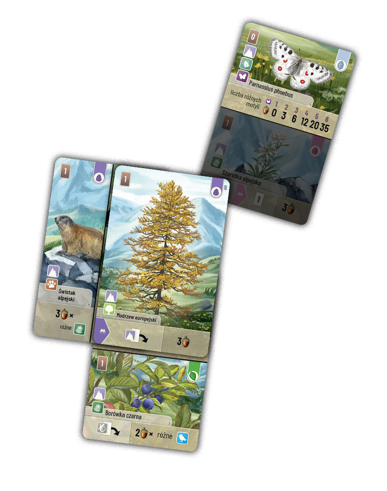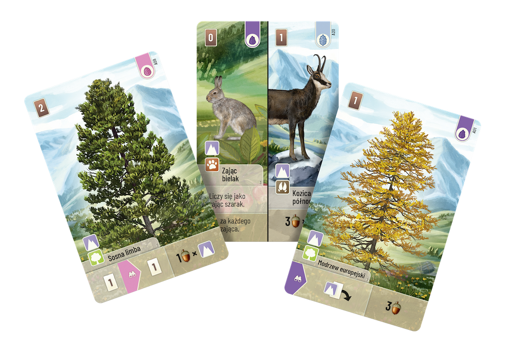 Leśne rozdanie: Alpy to rozszerzenie wprowadzające 36 zupełnie nowych, przepięknie ilustrowanych kart z alpejską fauną i florą. Znajdziesz wśród nich 2 dodatkowe gatunki drzew, nowy rodzaj motyla oraz zwierzęta, rośliny i grzyby, które urozmaicą Twoje rozgrywki i pozwolą na wypróbowanie nowych strategii.