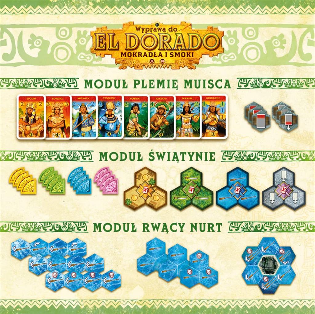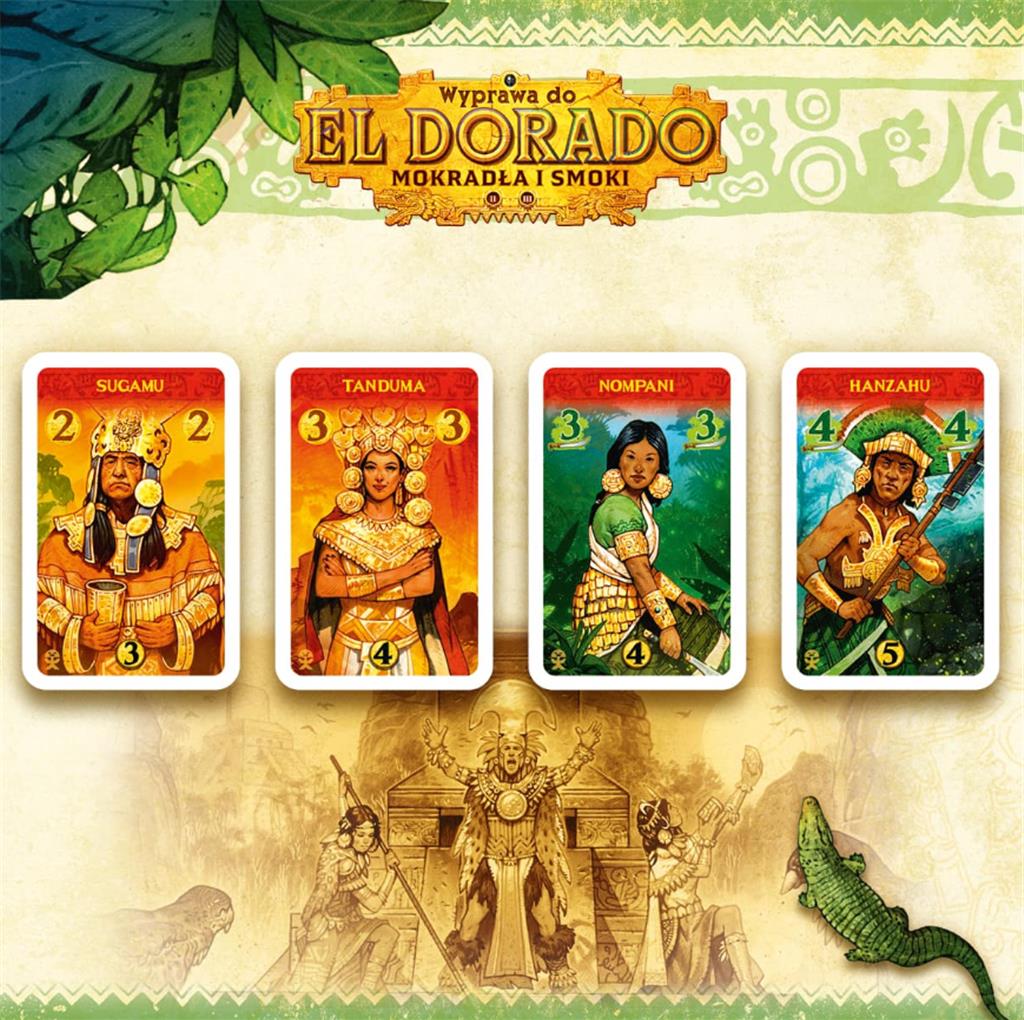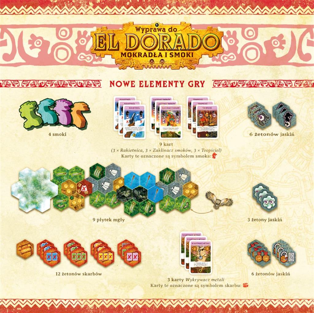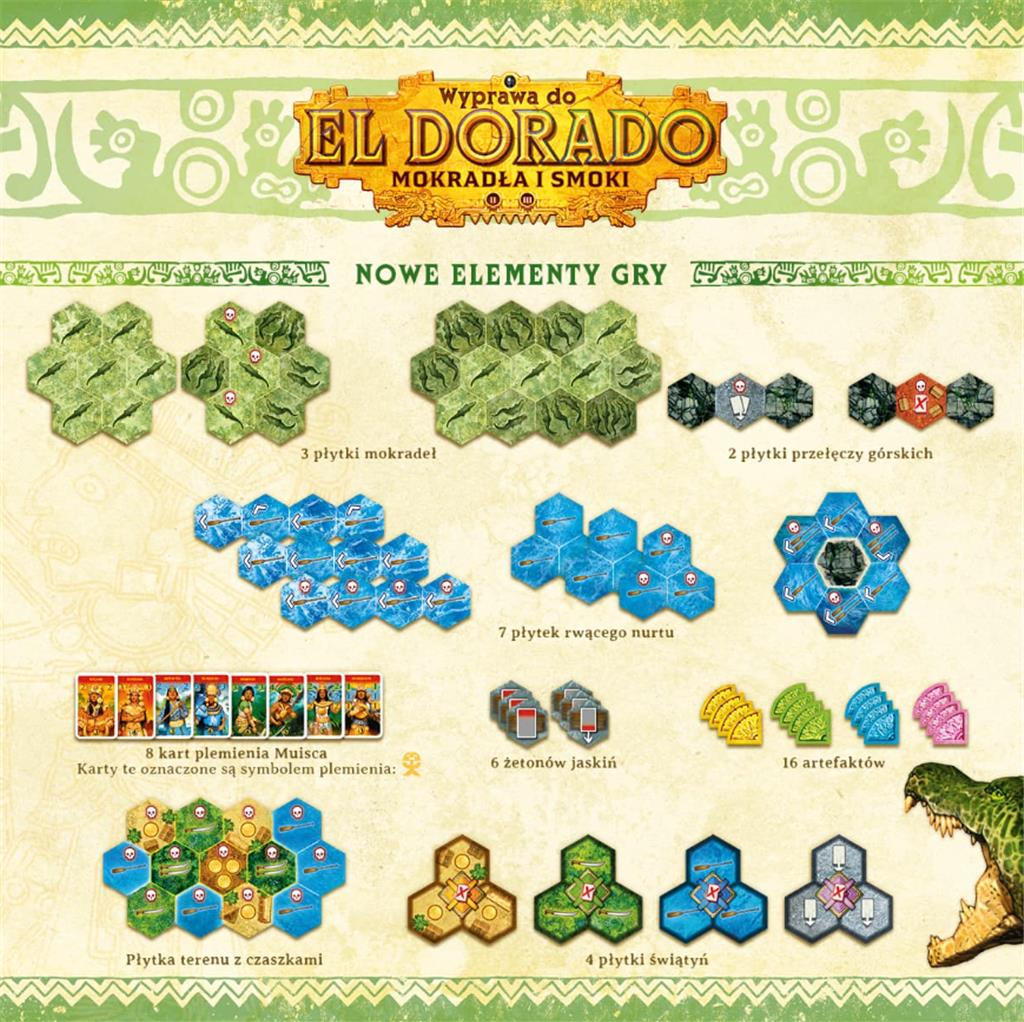 Podczas gry Wyprawa do El Dorado: Mokradła i smoki czekają na Was nowe wyzwania: mokradła pełne krokodyli, rwące nurty rzeki, lokalne plemię, groźne smoki oraz tereny pokryte gęstą mgłą. Spotkacie też tajemnicze świątynie oraz skarby, które będziecie mogli zdobyć!